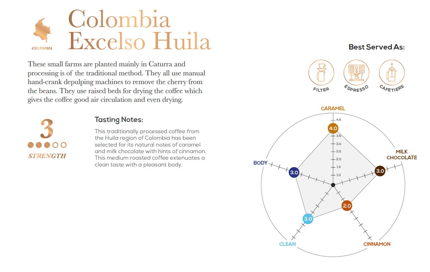 We’ve chosen beans from the Huila region of Colombia for their natural notes of caramel, milk chocolate and hints of cinnamon. The final product is a medium roasted coffee that extenuates a clean taste with a pleasant body.