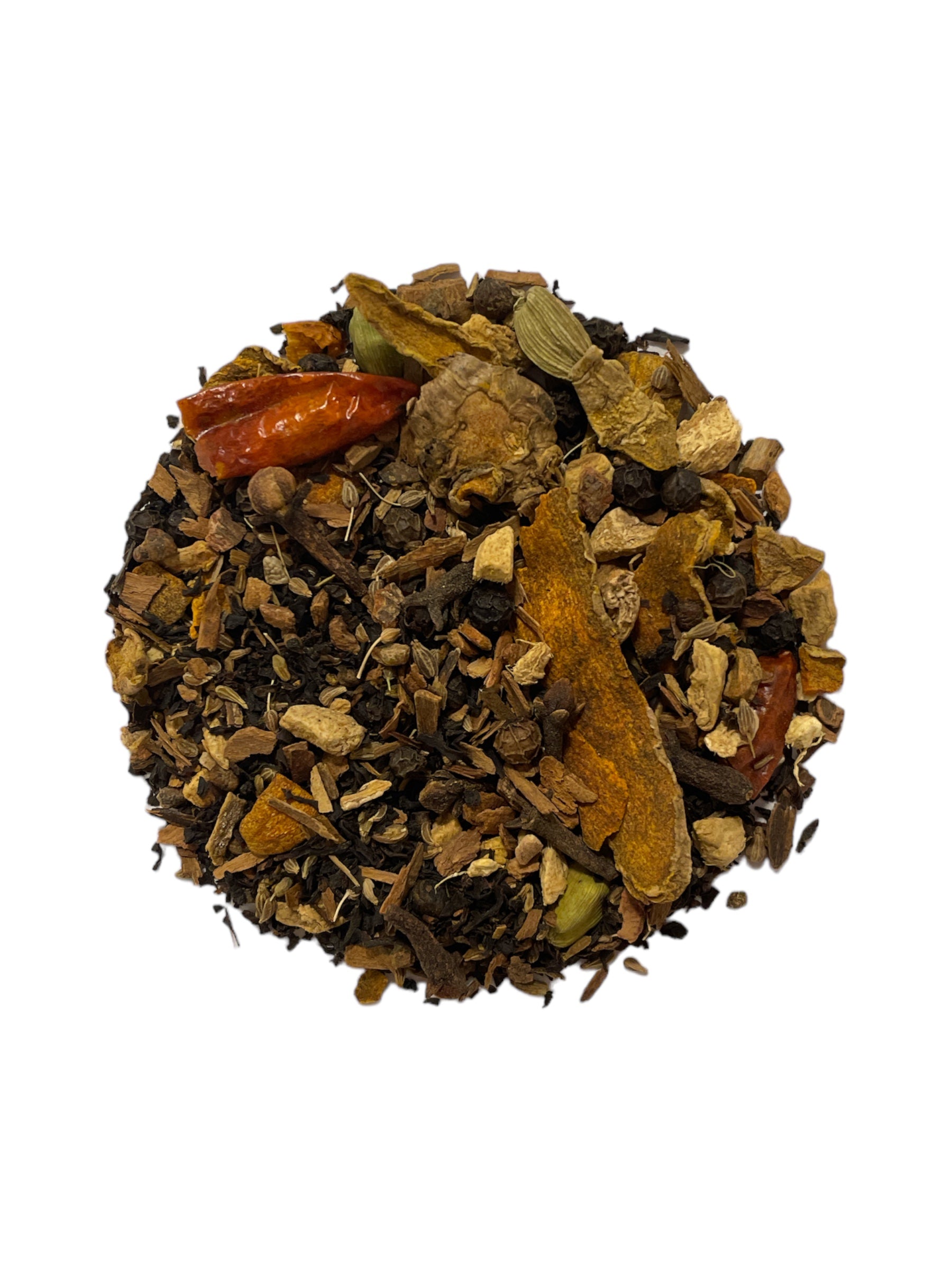 Ingredients: Black Tea, Cinnamon Pieces, Turmeric Slices, Ginger Pieces, Aniseed, Black Pepper, Cloves, Cardamon Seeds, Cardamon, Chilli, Chicory Roots.